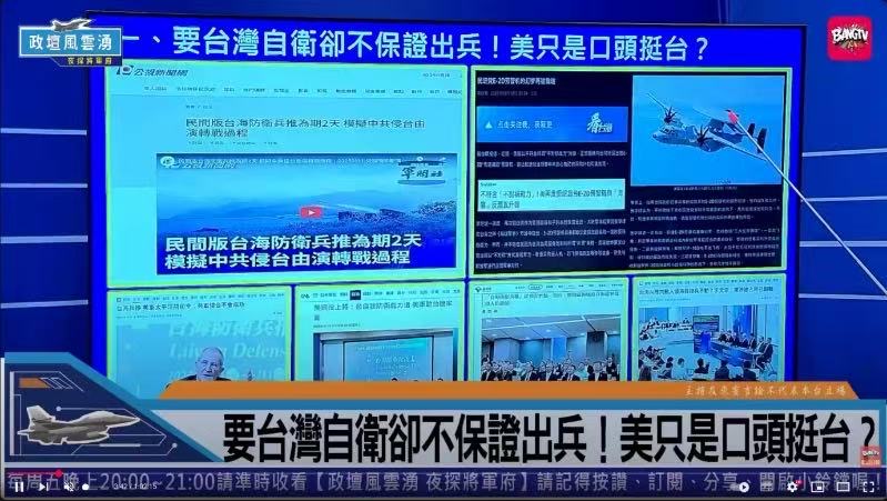 主持人張延廷將軍提問來賓,引菱傳媒、民視相關兵推報導,但實際上要台灣自衛卻不保證出兵!美只是口頭挺台?
