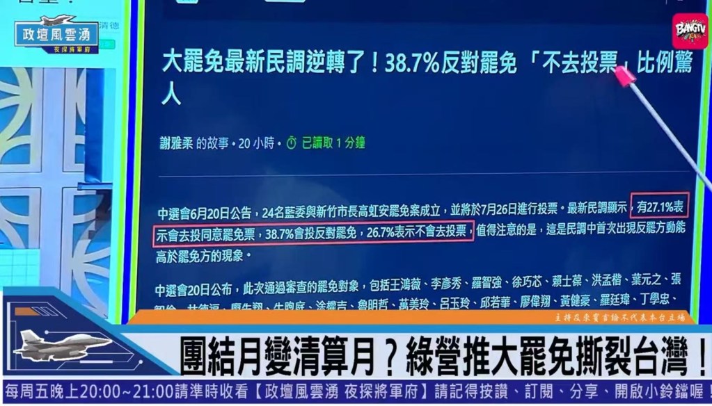 大罷免的戰況,最近的「震傳媒」民調出現不同意38.7%,同意27.1%,不投票26.7%,我認為選前20天許多大型的民調陸續出現,會比較客觀,更接近事實,目前雖有利藍軍,大家也要再觀察。