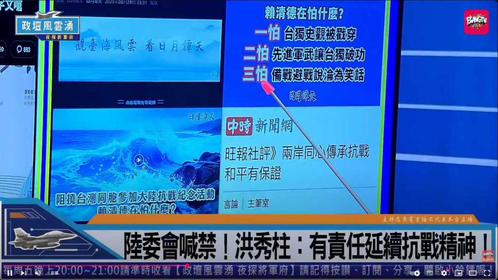 主持人張延廷提到大陸官媒《看臺海》所發佈「海峽時評」表示,在9月3日舉行盛大的閱兵儀式上,受閱官兵雄姿勃發、鬥志昂揚,新型戰車、無人作戰、網電作戰、高超聲速、防空反導等大陸現役主戰裝備和戰略重器一一亮相,宣示了中國人民解放軍粉碎「台獨」分裂和外來干涉的鋼鐵意志和強大實力。解放軍必將堅決維護國家主權、統一、領土完整,為實現中華民族偉大復興提供戰略支撐。而洪秀柱參加卻引來陸委會恐嚇,簡直情何以堪。