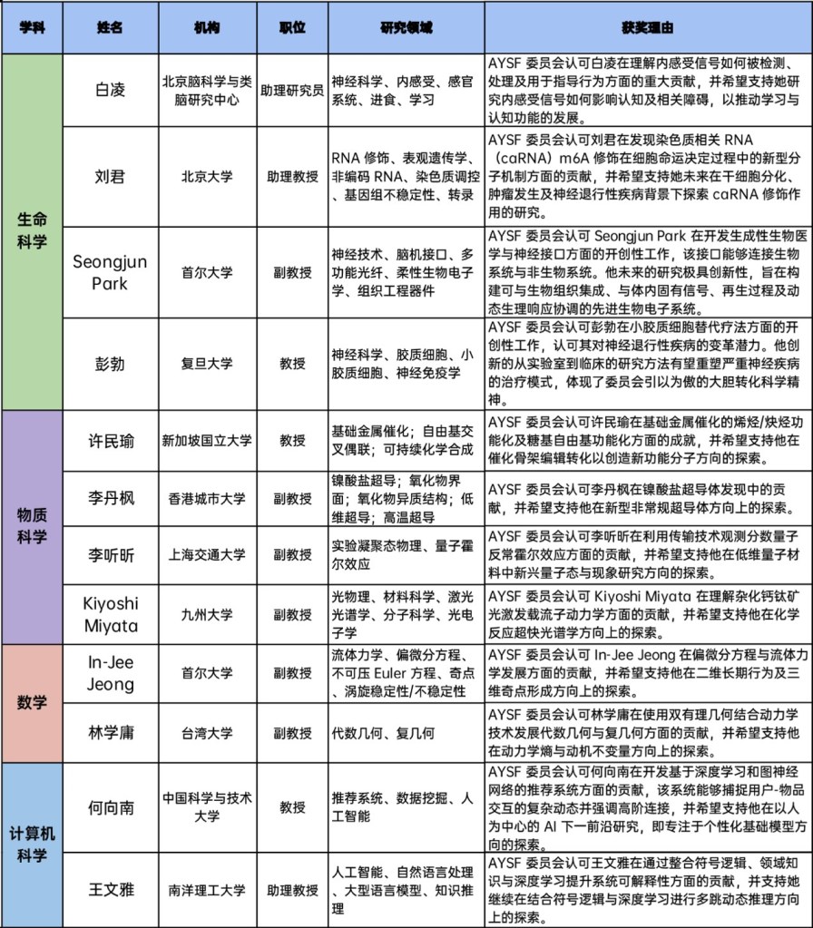 2025亞洲青年科學家基金專案頒獎典禮依據生命科學、物質科學、數學與電腦科學領域,對在各自研究領域中做出傑出貢獻的青年科學家進行了表彰。