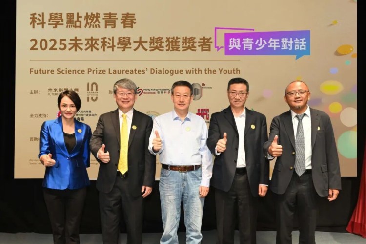 10月26日,2025未來科學大獎獲獎者對話青少年活動在香港太空館舉行。 2025未來科學大獎-生命科學獎獲獎者徐星(下圖中)、周忠和(下圖右二),物質科學獎獲獎者戴希(下圖右一)、丁洪(下圖左二)、跳水奧運冠軍高敏(下圖左一)出席活動,以科學Talk Show的形式分別向約300名青少年科普他們的獲獎科學成果,並與青少年分享自己成長、求學、科研的故事。 跳水奧運冠軍高敏作為特邀嘉賓亮相活動,與科學家和青少年展開對話與交流。 現場座無虛席,活動更同步線上直播,讓更多青少年朋友與科學愛好者共同感受科學的魅力。