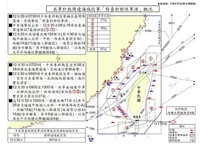 12月29日,中國人民解放軍東部戰區在台灣周邊海空域發起「正義使命-2025」聯合演訓,陸官媒「看台海」以東部戰區發布,解放軍演習布陣涵蓋北部、中部及西南等5大海域與空域,進行無預警實彈射擊。此次演訓是對「台獨」分裂勢力及外部干涉的嚴重警告,旨在捍衛國家主權、安全與領土完整,將持續組織反分裂行動。