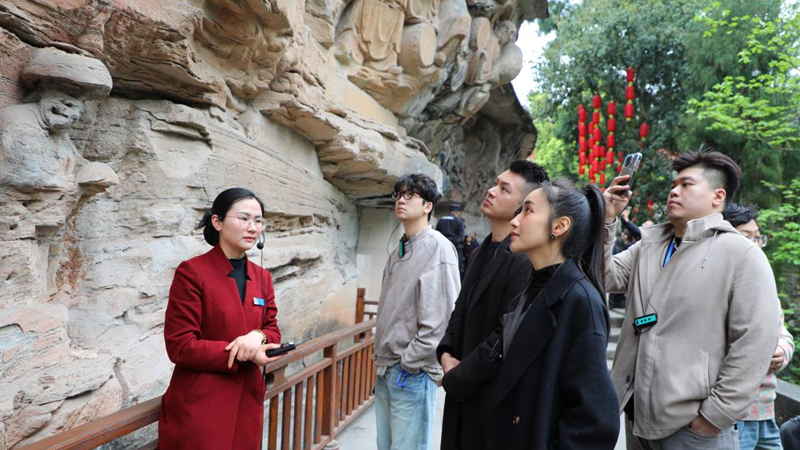 在大足石刻寶頂山景區,台灣青年們被精湛的石刻技巧和深厚的文化底蘊所震撼。台灣青年張銀峻表示:“大足石刻是文創產業的富礦。台灣在文化創意、數位設計和品牌運營方面有豐富經驗,而大足石刻擁有獨一無二的IP資源。我們期待將台灣的文創理念與石刻文化相結合,共同開發文創產品。”