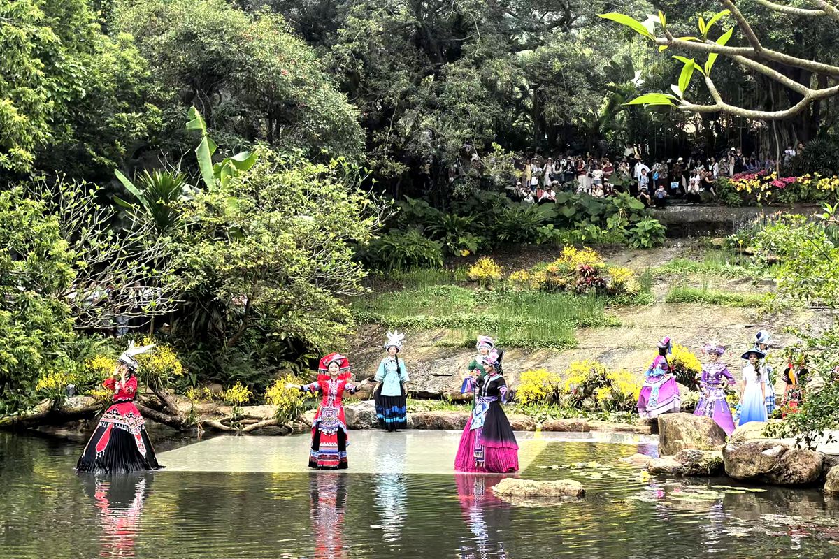 “三月三”期間,正值青秀山舉辦春季花藝展。蘭花、繡球、月季等特色花卉被匠心獨運地置入自然景觀——或懸於枝頭,或嵌入石縫,或鋪成花毯,與山間景致融為一體。滿園春色吸引各地遊客紛至遝來,景區內遊人如織,兩岸青年也紛紛打卡留念。臺灣自媒體人阿秋徜徉於繽紛花海,拍照、錄影忙個不停,她興奮地表示:“好像來到童話世界,太治愈了!”