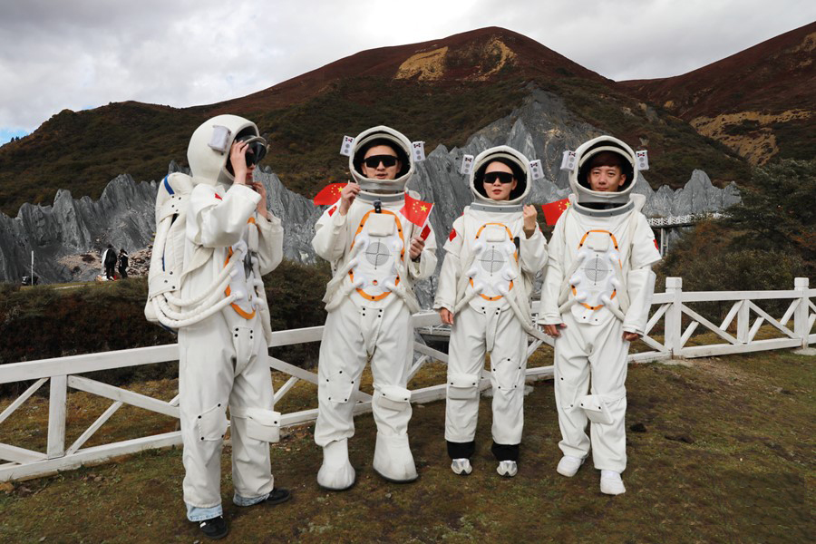 兩岸媒體記者、自媒體人身穿太空服進行視頻創作。(台灣網記者 李寧 攝) 記者歐陽光宗整理編輯 台灣網甘孜1繼續閱讀 “兩岸新傳媒尋美川藏線主題“異域星球”的別樣風情"